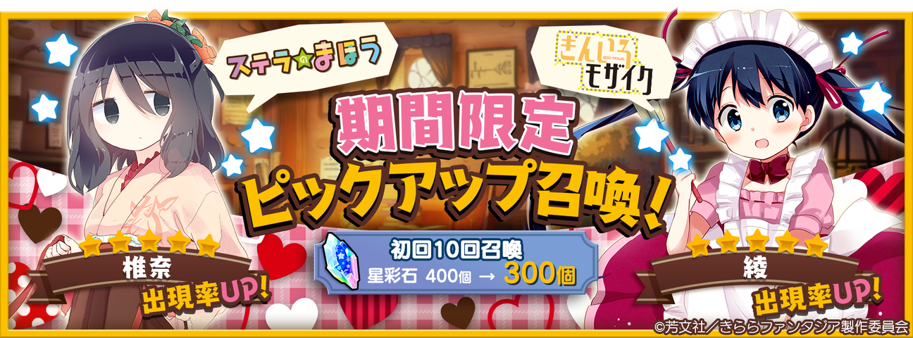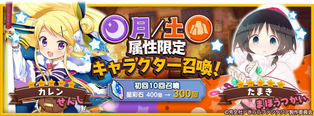 ★5の「きんいろモザイク」カレンや「ステラのまほう」たまきなど、月/土属性のキャラクターだけが登場する召喚開催