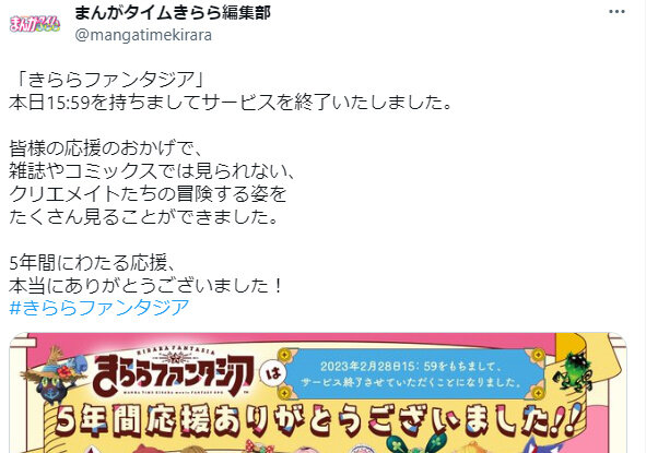 昨日、きららファンタジアが2023年2月28日にサービス終了する事が発表されました。