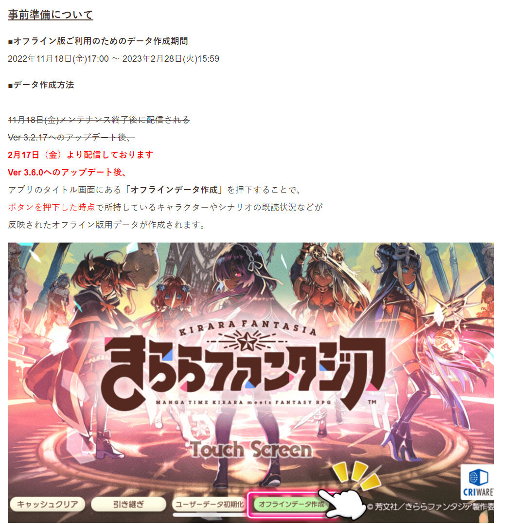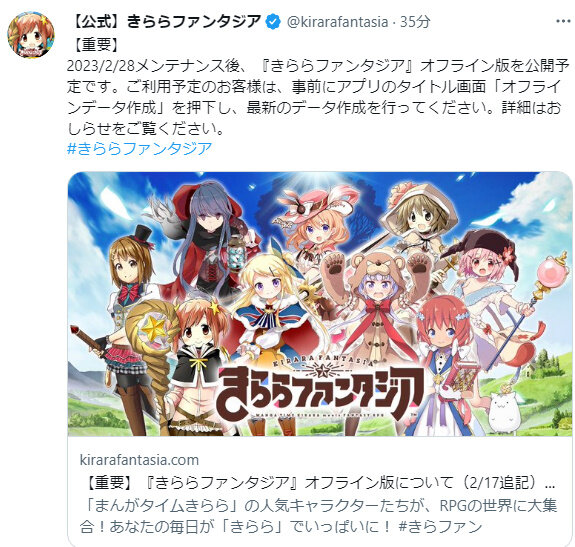 2023/2/28メンテナンス後、『きららファンタジア』オフライン版を公開予定です。ご利用予定のお客様は、事前にアプリのタイトル画面「オフラインデータ作成」を押下し、最新のデータ作成を行ってください。詳細はおしらせをご覧ください。#きららファンタジアhttps://t.co/LVaAwKiEBu
